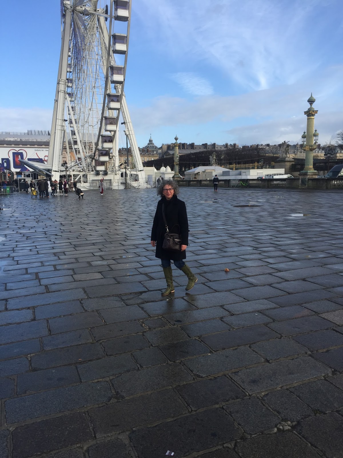 | Nana/Frances/Materfamilias in Paris: you will know me by my curls, the Eiffel tower by its lines of metal, and the Patisserie to the right, in red, by my say-so. I was told of the Patisserie by the artist, my 5-year-old granddaughter, who helped Integrate this Traveller’s experiences by drawing them for her, right here in Vancouver, at home. |