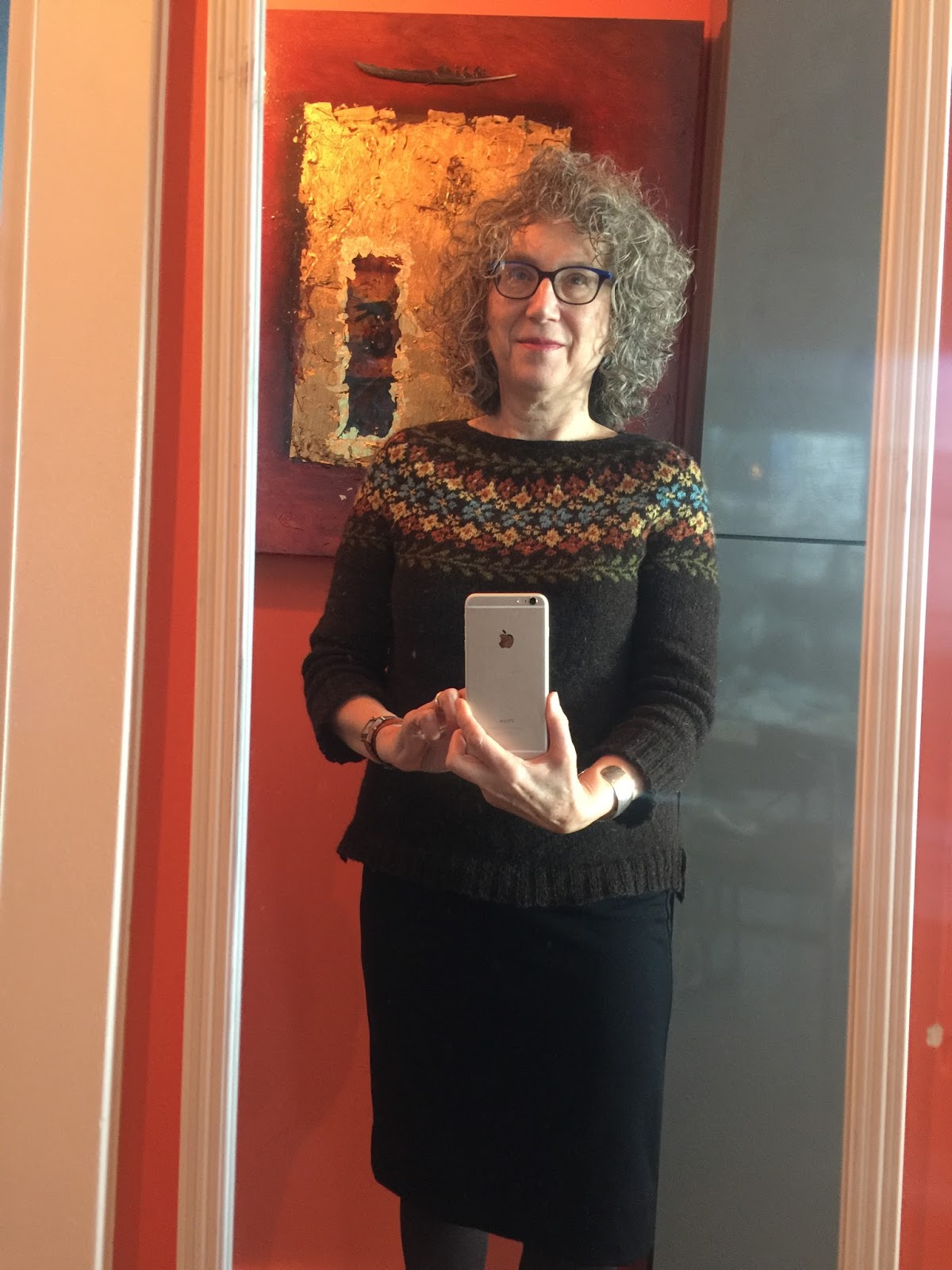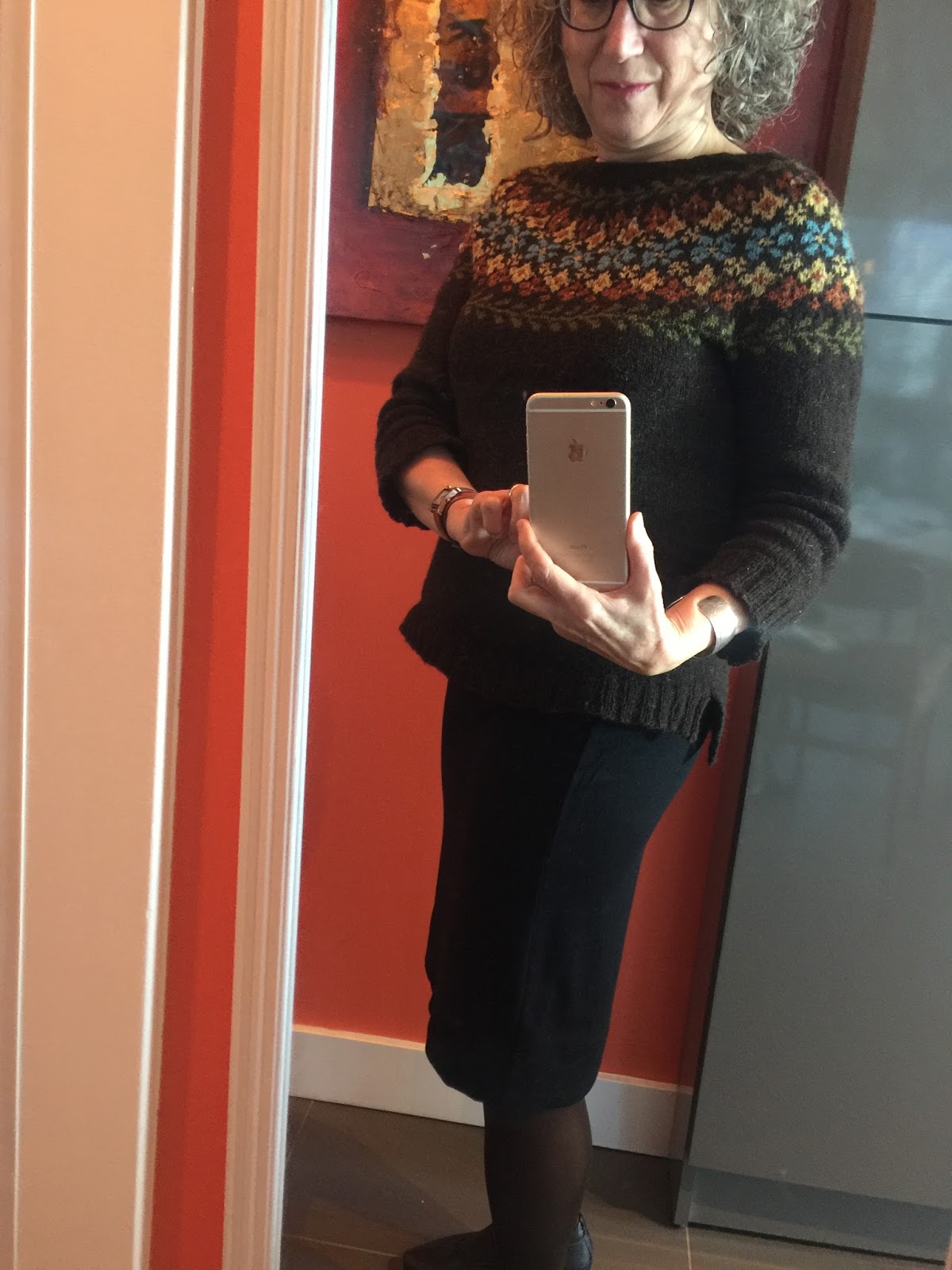 Lovely sweater, especially in front of the wall that picks up one of the colors! Hope your week goes smoothly!