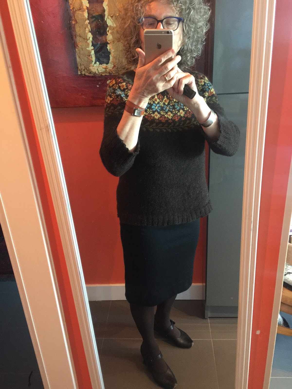 But I did wear it with a skirt the other day, a simple black knit pencil skirt, merino. I happened to have a dark brown pair of tights and slipped them on before sliding my feet into these low-heeled Think! shoes, all but the sweater being wardrobe staples From Way Back. Scarcely wear heels at all these days, but since we were heading out to our first Ballroom Dance class, I thought they might be the ticket.