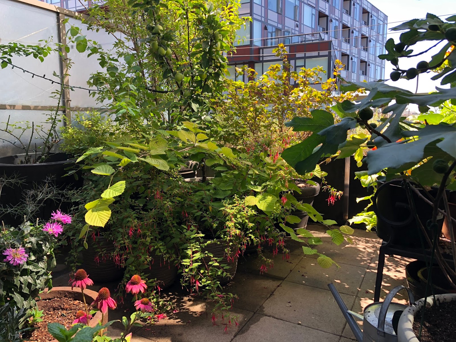 And I realize I haven’t shared much about the garden’s progress this summer, so I thought an update might be in order. Today’s won’t be at all comprehensive, but I’ll try to get ’round to the various corners over the next week or two, and I’ll happily answer any questions about this condo terrace container-gardening — from my limited experience.