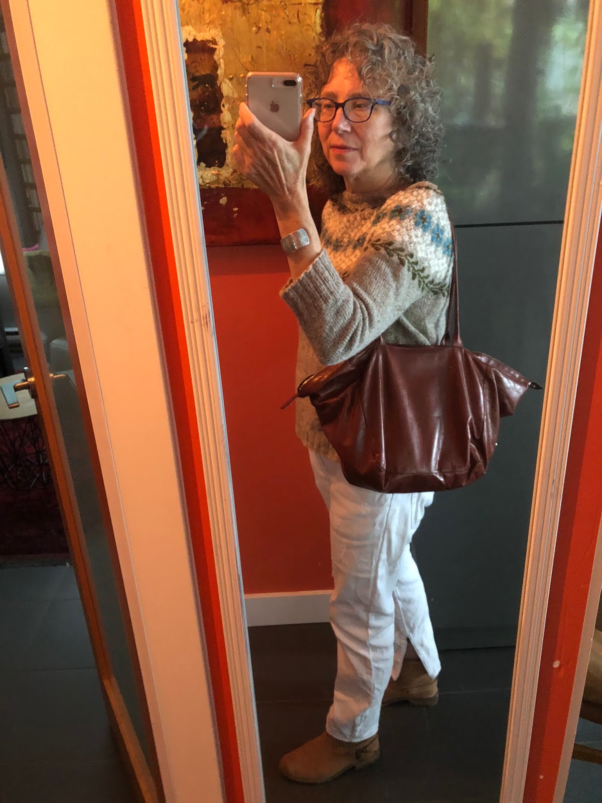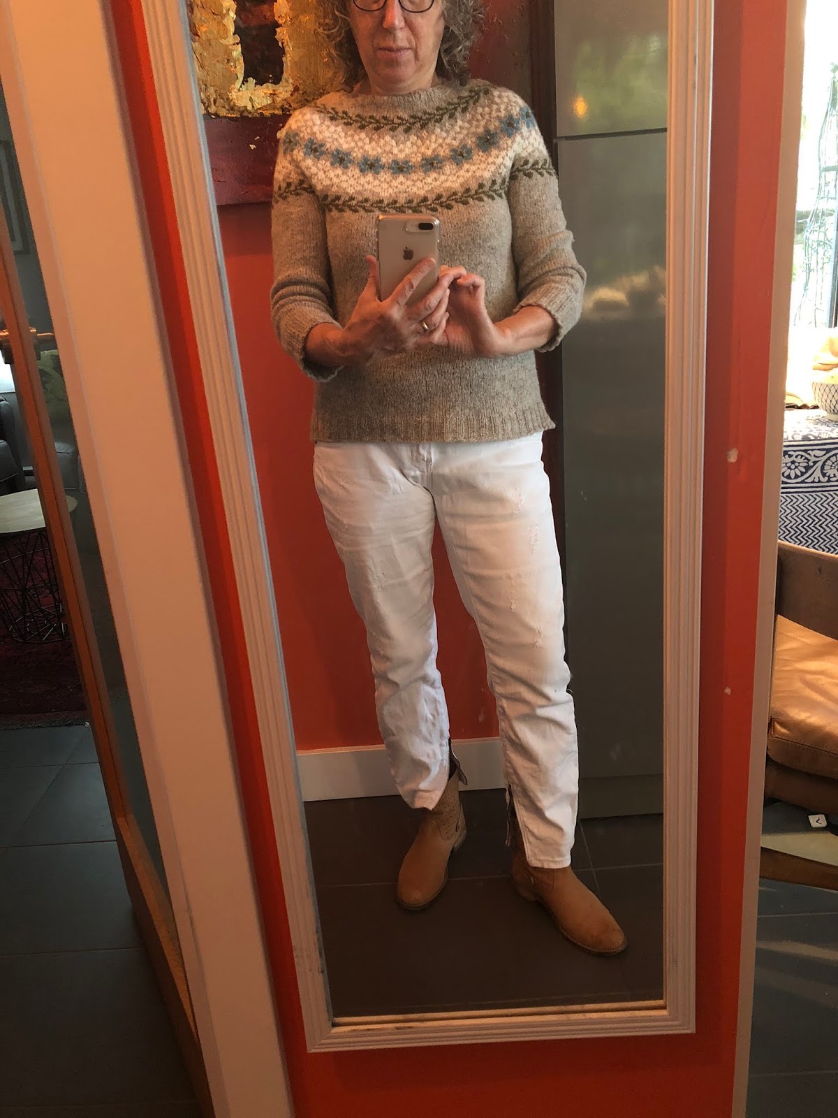 But I did recognize the blogging potential when my daughter came over to pick up the Birkin sweater I made earlier this year — and wore often after modeling it for you here. She’d complimented me on the newer, more neutral version I’m wearing in these photos with my white jeans, bought-them-in-Bordeaux tan suede ankle boots, and M0851 bag. . .