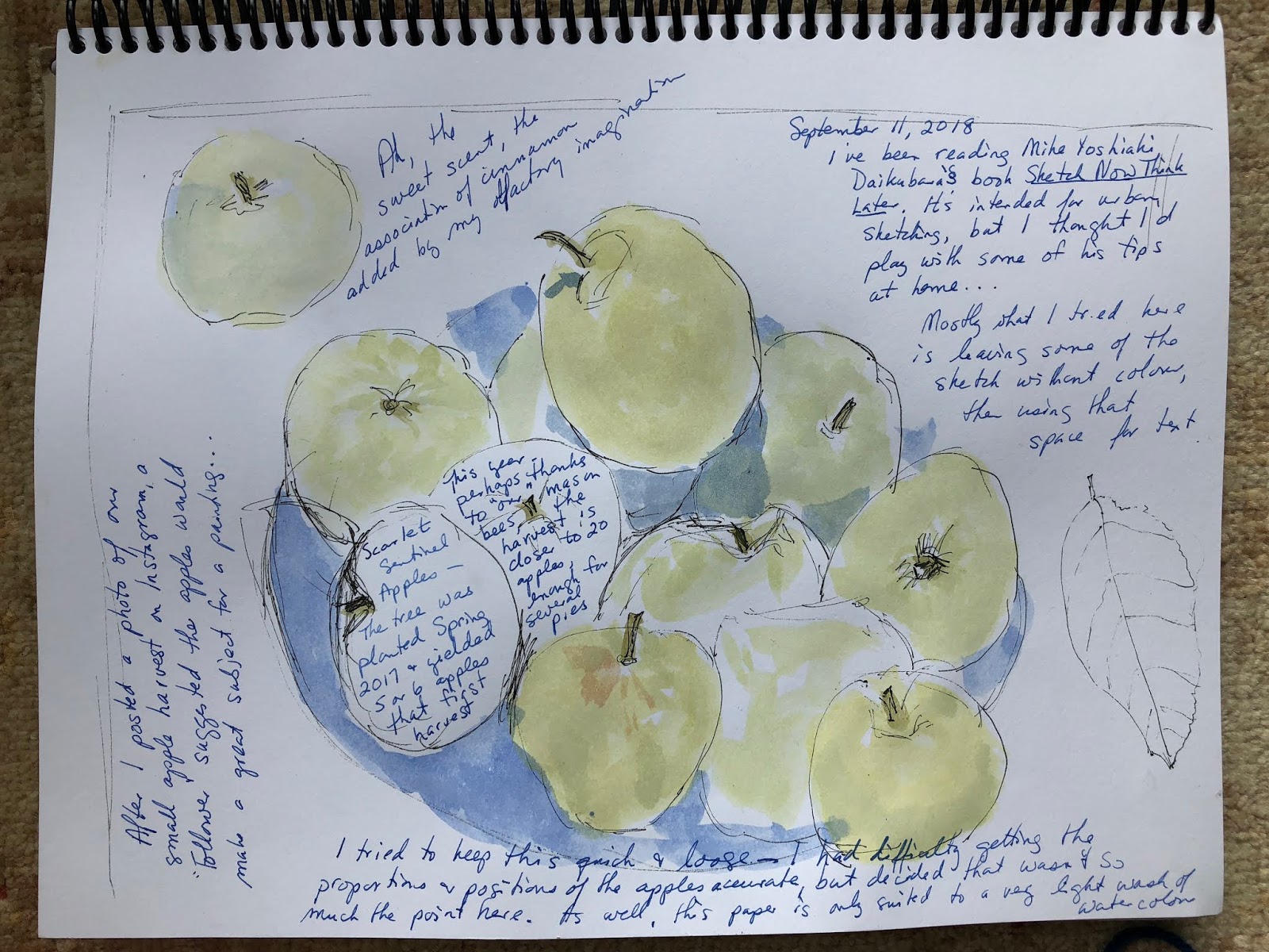 Bottom of the page: I tried to keep this quick and loose — I had difficulty getting the proportions & positions of the apples accurate[ly] but decided that wasn’t so much the point here. As well, this paper is only suited to a very light wash of watercolour.