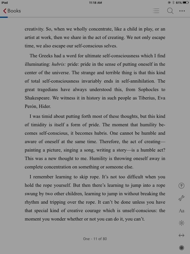 Interruption from l’Engle, about 10 pages into her first chapter, an argument about timidity as a form of pride. She says, “The moment that humility becomes self-conscious, it becomes hubris. One cannot be humble and aware of oneself at the same time. Therefore, the act of creating . . . is a humble act? . . . Humility is throwing oneself away in complete concentration on something or someone else.”