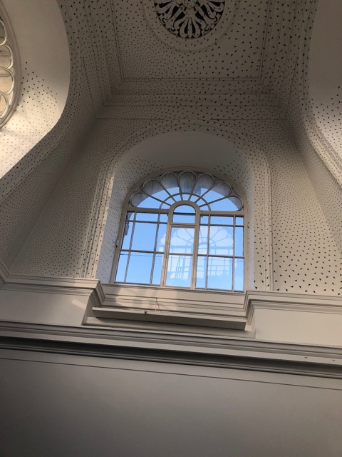 In the gallery’s leaflet on The Stairwell Project, Chief Curator Keith Hartley observes that we “tend to forget” that, within the tradition of western art, decorative painting of walls and ceilings was a common practice. He traces the development from an expectation that art be utilitarian, to the patronage of artists by aristocracy which began in the Renaissance, and then to the changing expectation which led to an individual artist dependent on the market.