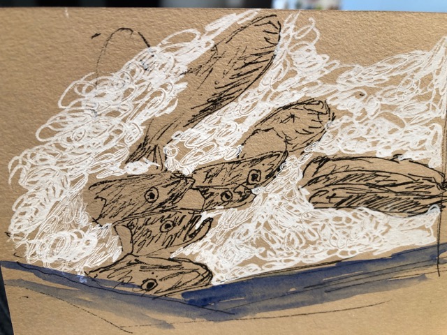 So I showed her, a bit defensively advising that I’m still very much an amateur. She nodded an acknowledgement, a tentative approval, but mostly I sensed a bemusement that anyone might use their free time to hang around markets sketching fish heads on ice. Fair enough. . . .