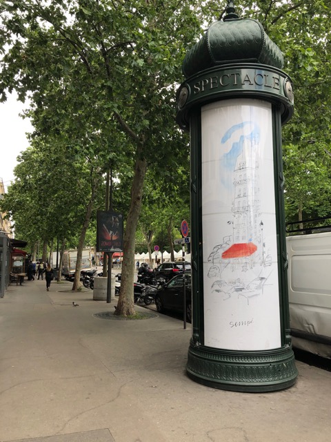 | He’s so iconic, is Sempé — the day after viewing the exposition of his work in Bordeaux’s Musée de Mer et Marine, we walked past this Morris column advertising the New Yorker magazine via an image of a Sempé cover illustration. . . |