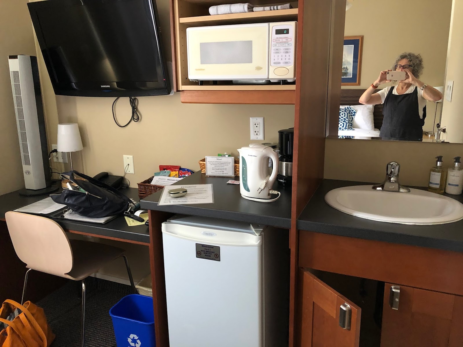 Far from 5-star luxury, but I love the simple thoughtfulness, the self-contained economy of this small space — and you long-time readers will know how important that tea kettle is for me. . .