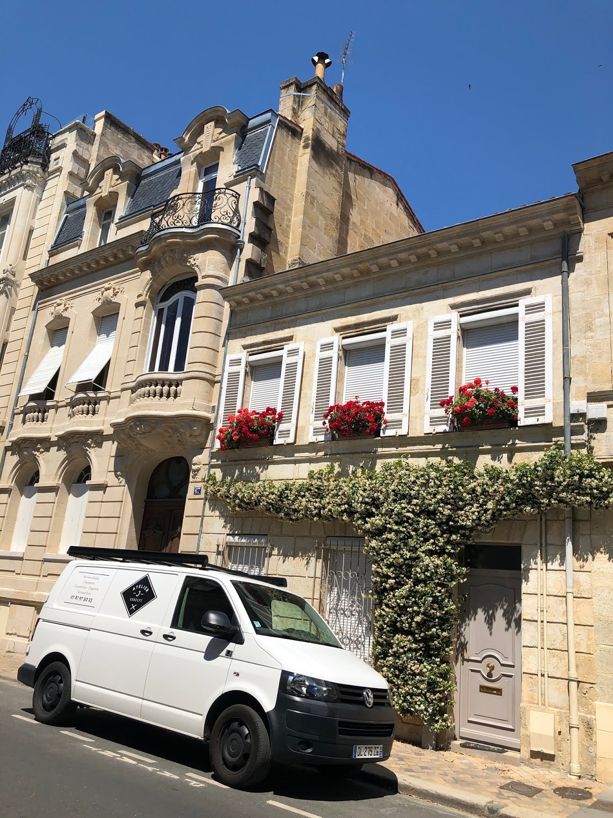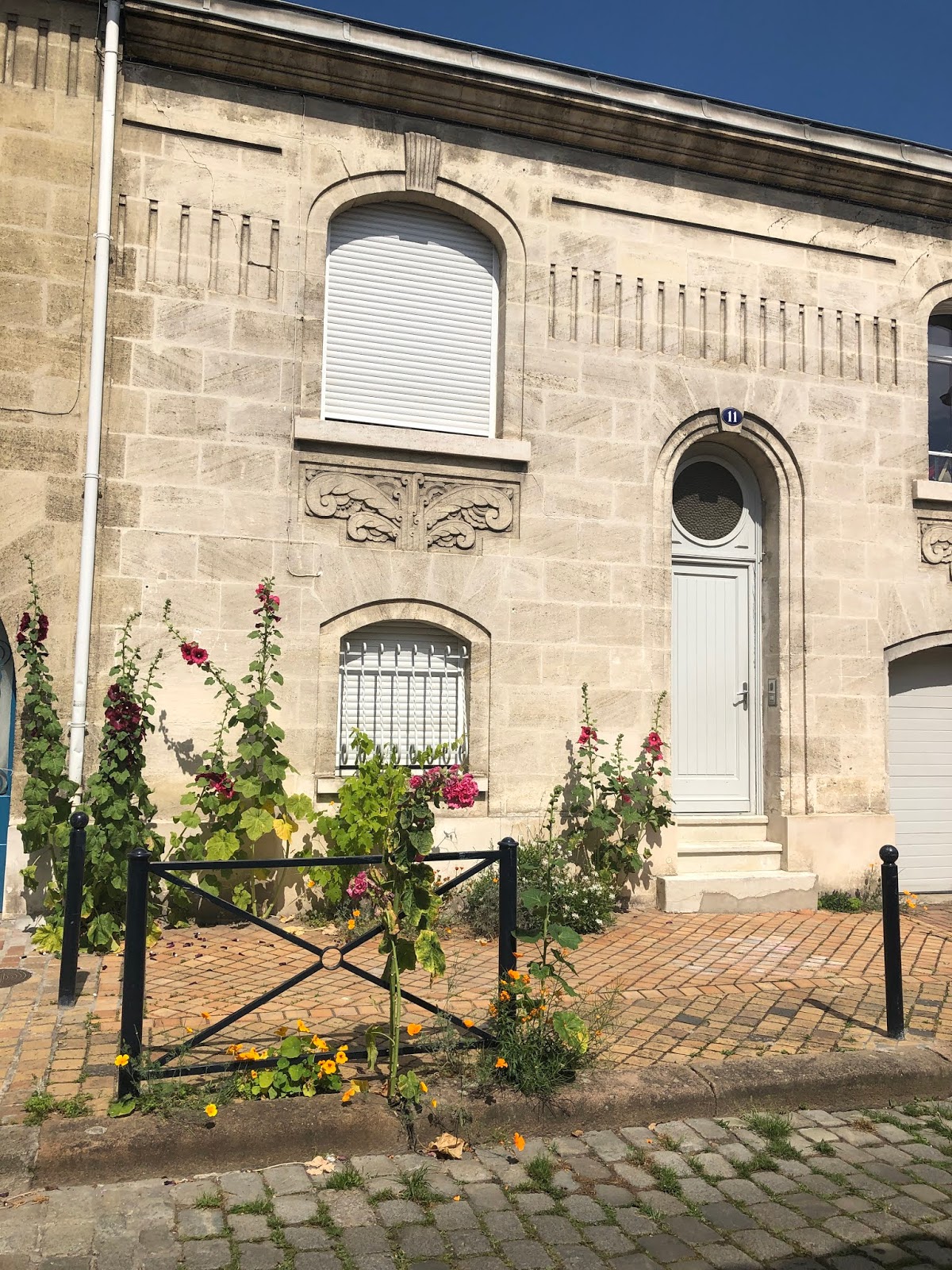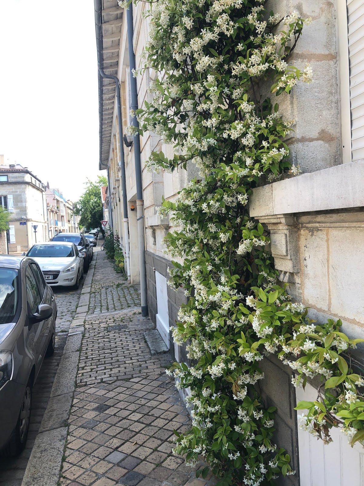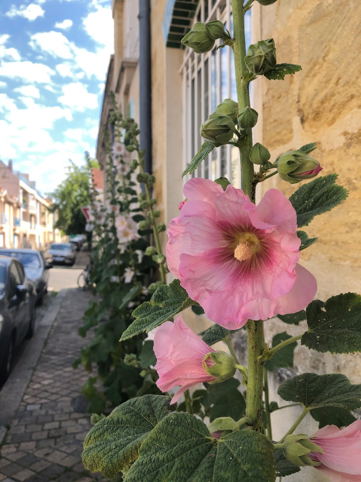 The photos were all taken in “our” neighbourhood in Bordeaux just last month — stars of these sidewalk plantings are generally hollyhocks, jasmine, and the occasional climbing or shrub rose; the window boxes generally spill red, coral, or pink geraniums, sometimes impatiens. . .