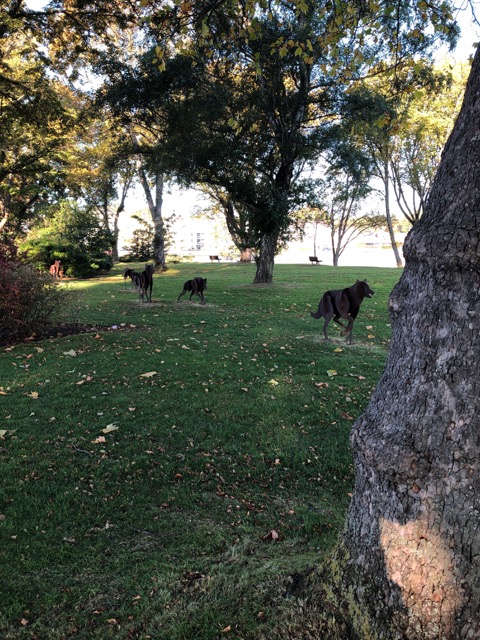 We went for walks together, admiring local sculpture (the metal wolves are chasing a deer, which I failed to spot until I’d put the camera away — you’ll have to imagine it)