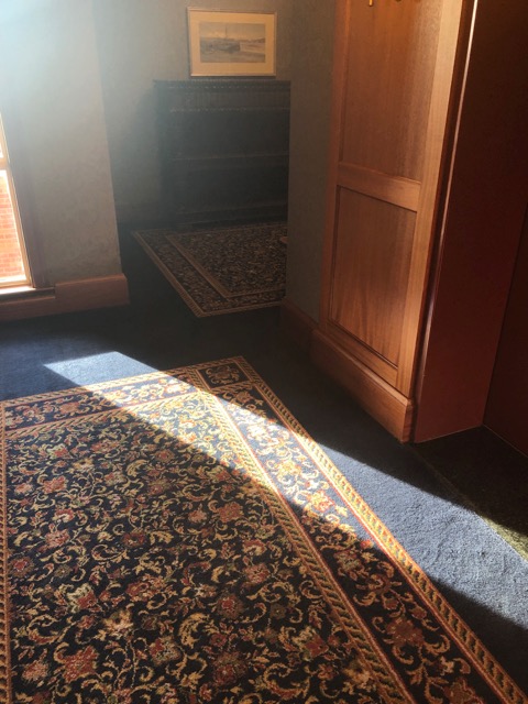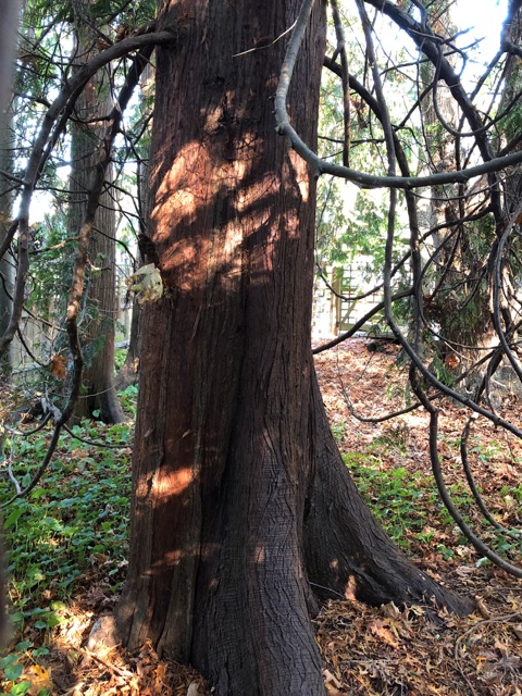And after a spot of forest-bathing, that sensibility is awakened, and I see echoes of the forest . . . as in the hotel hallway, where a shaft of sunshine next to a wood-paneled column recalls patterns of sunlight on a tree trunk. . .