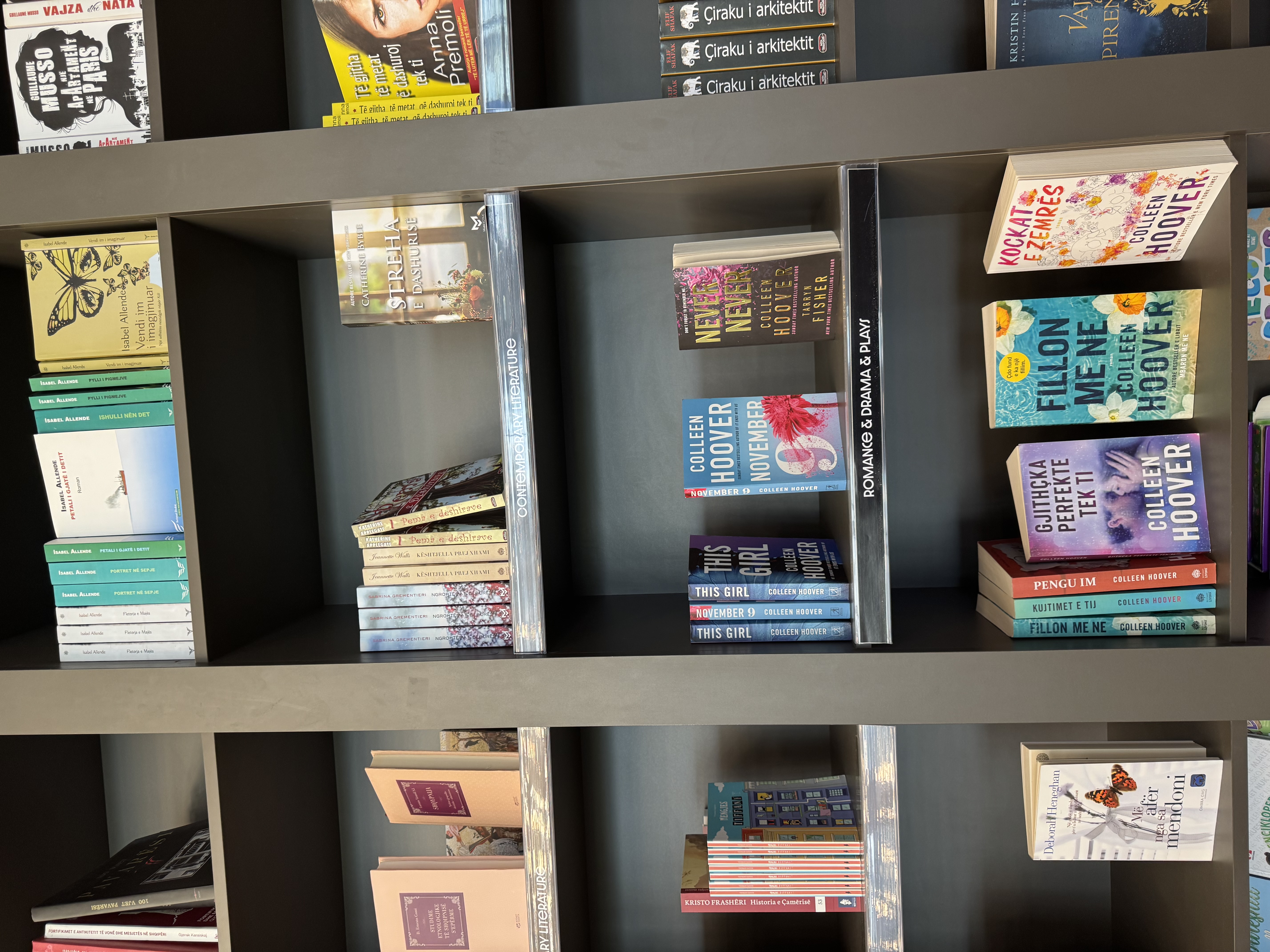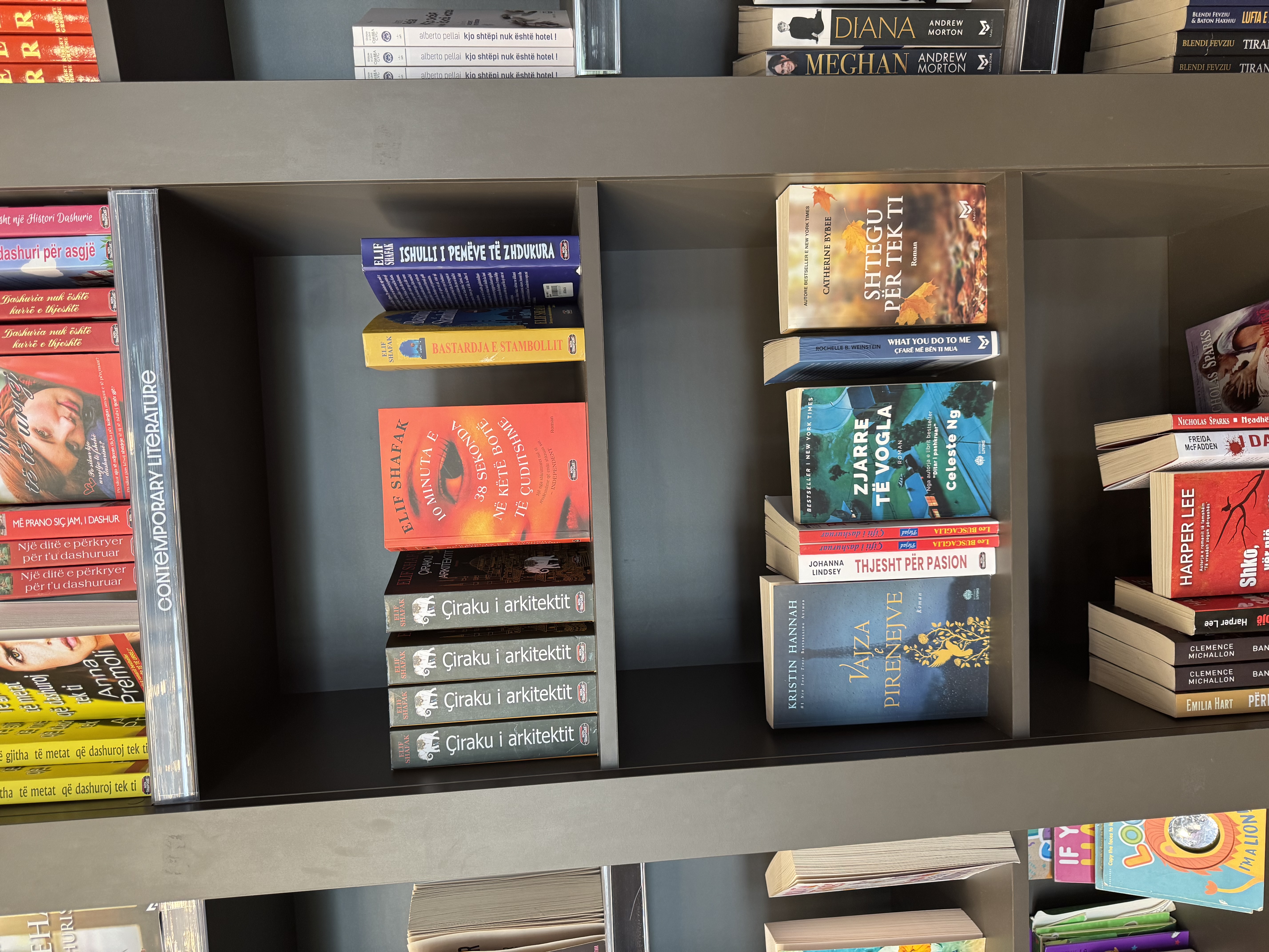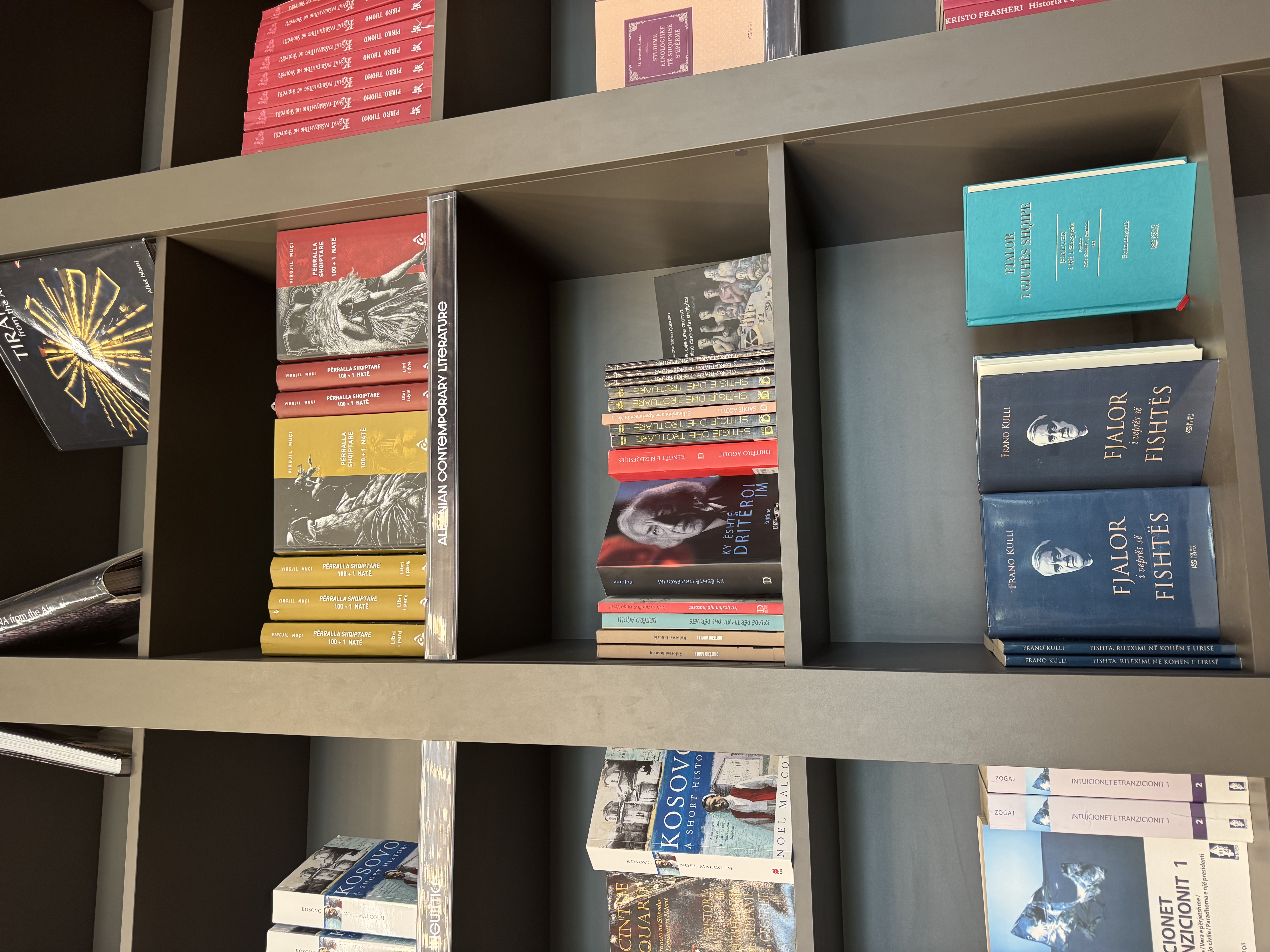 Photos accompanying this post are from the bookstore/coffee lounge in the Tirana (Albania) airport, as seen this past April. By now, you know that I can’t resist capturing photos of bookshelves and book window displays when I’m travelling. . .